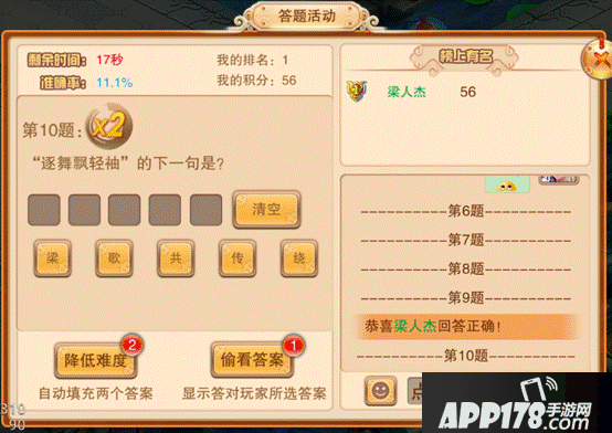 除了答对每道题能获得经验和阅历奖励之外,每轮答题的前三名玩家在答题活动结束之后还能获得丰厚的物品奖励,为了榜上有名,大家一定要多多误导其他玩家。。噢不,是要多点丰富自己的知识储备噢!