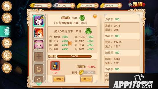 除了资质能够提升宠物战斗力以外,提高宠物成长值也能够提高宠物战力。提升成长值后,宠物的四维都会相应地增加,从而增加各项基础数值。成长值每到一个阶段,还会额外奖励属性点,因此要为每个阶段目标而好好努力哦!