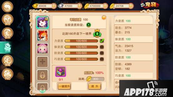 玩家可以使用【宠物资质丹】来提升宠物的资质,每次提升成功都会提升1~3点资质,提升失败则资质不变。宠物资质越高,每次提升需要的宠物资质丹也越多。