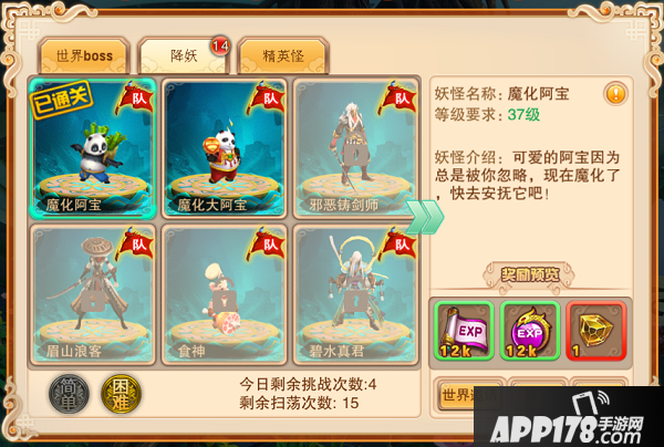 1、“简单”模式降妖只能单人挑战,无法组队挑战。玩家需要当前一关卡挑战成功之后才能解锁下一关并进行挑战。每一关挑战成功都能获得相应的奖励。当怪物被挑战成功之后不可再次挑战,奖励也只能获得一次。