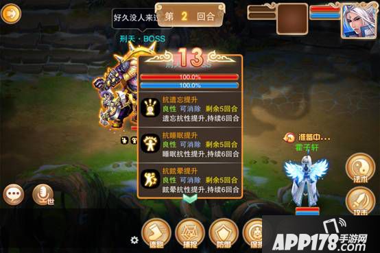 在第一回合,刑天会给自身附加五个提升抗性的BUFF:遗忘、睡眠、眩晕、嘲讽、石化。此时的应对方法是:如果队员里面的逍遥敏捷比较低,则可以在第一回合使用清明咒去除BOSS的增益,因为BOSS会先手使用增益技能,如果队里的逍遥比BOSS先手攻击,则在第二回合使用清明咒。