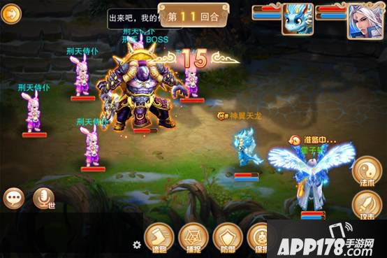 从上面两个图能看到,我在第三回合已经把所有侍仆都消灭了,但是刑天在后面的战斗中又重新把侍仆都召唤出来了,我们就要重新打一遍了。所以这里我推荐采取挑战乌天狗时的策略:留下一只侍仆。打侍仆时可以先让逍遥用移魂咒把侍仆都睡眠了,然后在单点击杀。