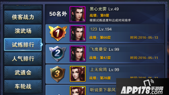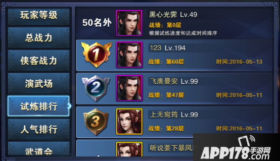 之前只有4个排名(战斗等级、总战力、侠客战力、竞技场),现在更新了更多排名,和之前的也有所不同,现在分别是玩家等级、总战力、试炼排行、人气排行、武道会、车轮战,在这里就不一一介绍了,大家可以去游戏里体验哦~没有最强只有更强,一起拼搏吧~