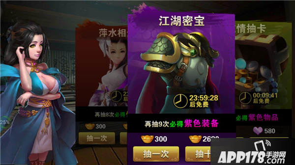 江湖密宝是用来抽装备的。也是24小时免费抽一次,有几率抽出整件的,装备品质有绿色、蓝色、紫色、金色,土豪金当然最好了。PS:抽10次最划算哦