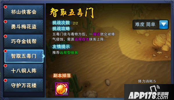 4.智取五毒门掉落侠客进阶单,是培养侠客的必需品。Ps:尽量选远程攻击来挑战,近战会被毒死