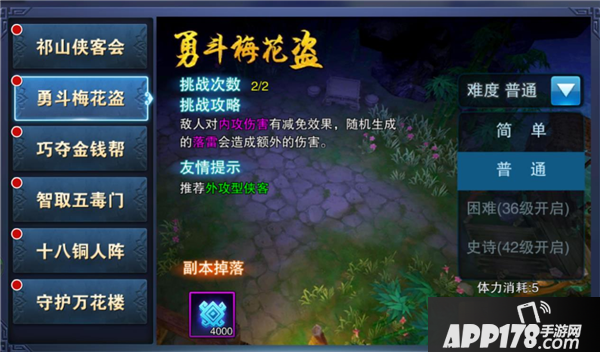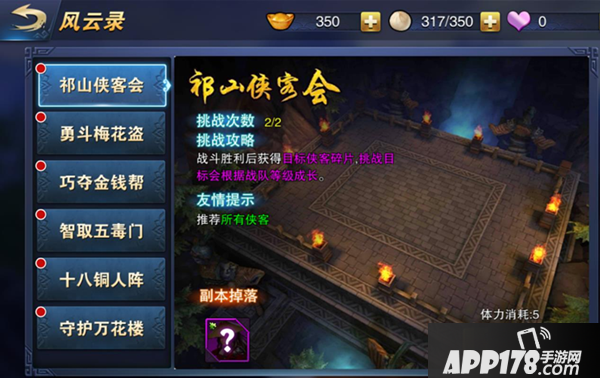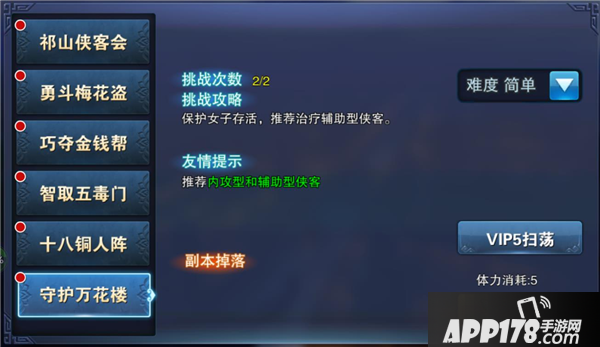 风云录,打开界面后可以看到挑战按钮,每个名字的副本每天可以挑战2次,每次挑战消耗5体力。每个副本给于的奖励都不一样,前期体力够的情况下可以每天都打,之后可以根据需求来打需要资源。除了祁山侠客会没有难度选择,其他的副本都是有简单、普通、困难、史诗的难度选择。