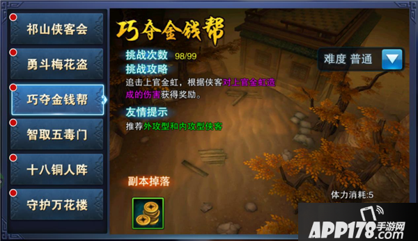 3.巧夺金钱帮,顾名思义就是打钱的啦。里面的BOSS是固定的上官金虹。根据伤害来决定你可以获得多少铜钱,铜钱还是非常缺的,所以每天2次金钱帮还是必打的。Ps带会眩晕的侠客打BOSS会比较有优势