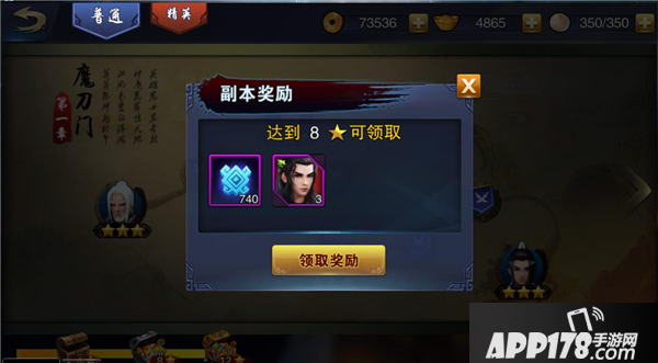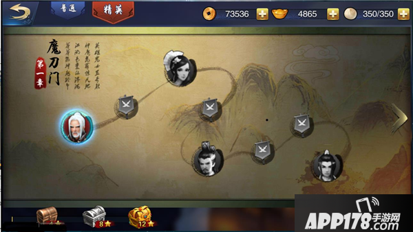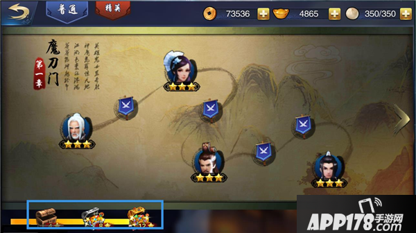 点击主界面中的【主线】按钮即可展开征程,主线关卡不仅可以体验游戏剧情,更是玩家获取大量侠客经验、侠客碎片和装备道具的地方。此外,左下角的宝箱也会根据玩家推图收集的星星数量来发放大量元宝、装备和侠客碎片奖励。