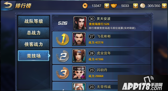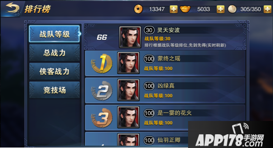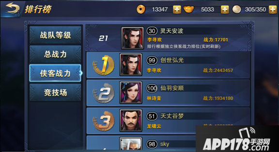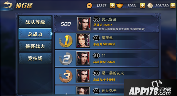 总战力排名:根据玩家战队所有侠客战力之和进行排名
