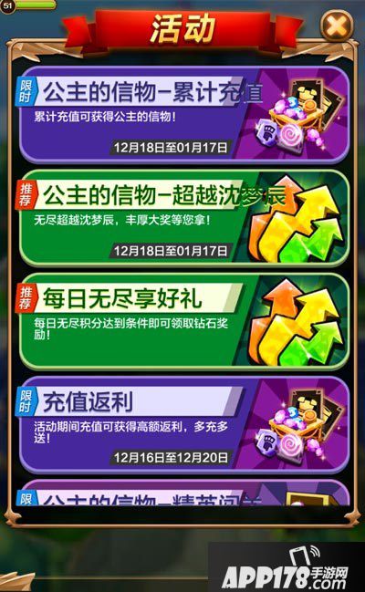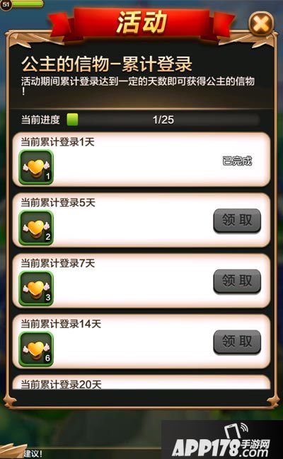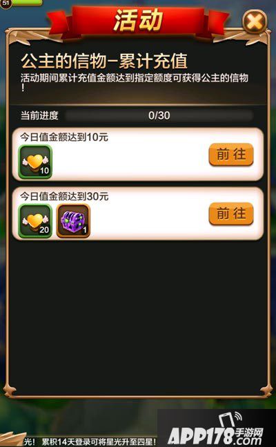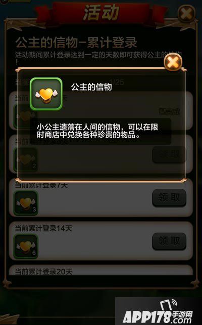 参与上述的互动达到活动要求可以获得公主的信物哦!建议每天登录,查看累积登录最高可以一次获得12个公主信物,充值一定额度也至少可以获得10的公主信物。
