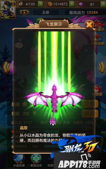 晶歌是驯龙战机中第二种风属性的飞龙,从小以水晶为零食的龙,拥有强大的元素魔法力量。它的生命值成长和元素攻击成长非常高,缺点是防御能力较弱。晶歌的弹道是一条直线不太适合应付小怪比较多的关卡。