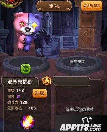 在整个宠物的造型上,邪恶布偶熊延续了一贯的风格,首先给人一种恐怖的赶紧,他的属性也是暗属性,初始一级的战斗机就达到了120,元素攻击105,他的技能名字叫做绝望光环,降低大型,中型和小型怪物的生命值上限69点。还是一个比较实用的技能,对于玩家的帮助还是十分给力的,因此建议大家多多去使用这个宠物。
