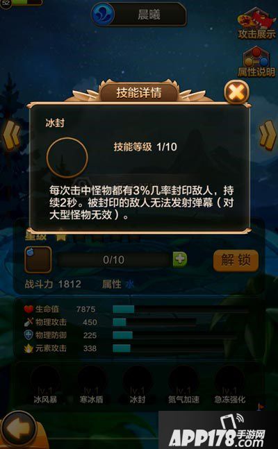 冰封属于特色技能,每击中怪物都有3%几率封印敌人,持续2秒,被封印怪物不能发射弹幕(对大型怪物无效)。这个技能简直开挂了,对于后期怪太多无法躲避弹幕的情况是神一样的拯救啊!