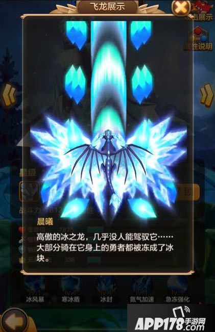 “晨曦作为高傲的冰之龙,几乎没人能驾驭它,大部分骑在它身上的勇者都被冻成了冰块。”这是晨曦的介绍,看到这里,我们可以判断晨曦应该是水系飞龙了,果不其然是水系的。