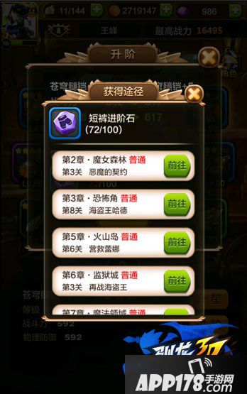 需要消耗道具短裤进阶石。玩家可以从普通关卡第2章第3关、第3章第8关、第5章第6关、第6章第3关、第7章第3关、第8章第8关、第10章第6关、第12章第3关、第12章第8关来获得。苍穹腿铠每提升10个等级需要进阶一次,随着进阶等级的提高需要短裤进阶石的数量也随之提升。(装备等级不可以超过玩家当前等级)