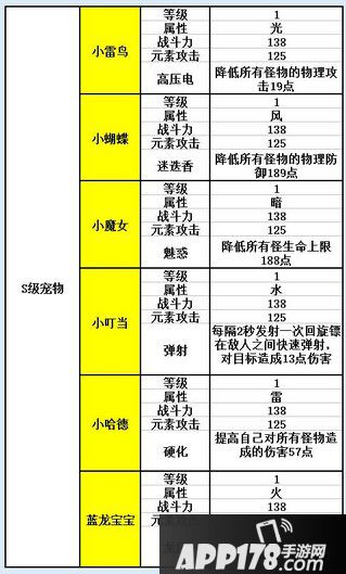总结:目前S级宠物只能通过活动和宠物合成得到,属于比较稀有的宠物。而且从现有的宠物来看,只有S级宠物才有光属性和暗属性,对于有追求的玩家来说,S级宠物无疑是最优秀的终极追求目标。
