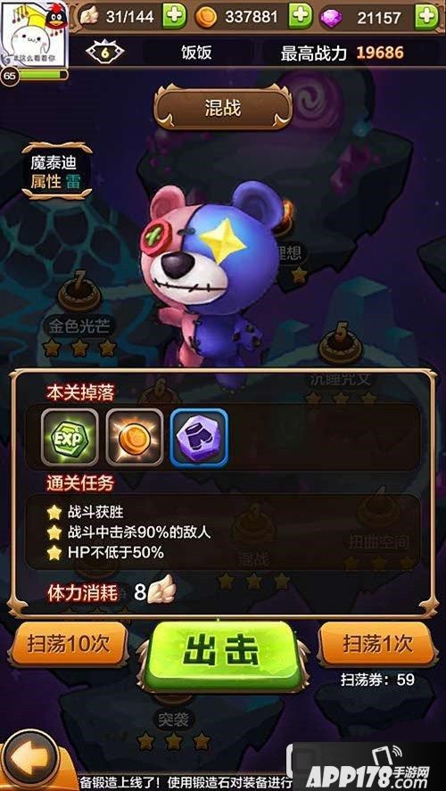 本关BOSS魔泰迪的血还是蛮厚的,如果觉得分散攻击的星光打击BOSS力度不够大不够快的话,可以用有集中攻击效果的晶歌来对付。