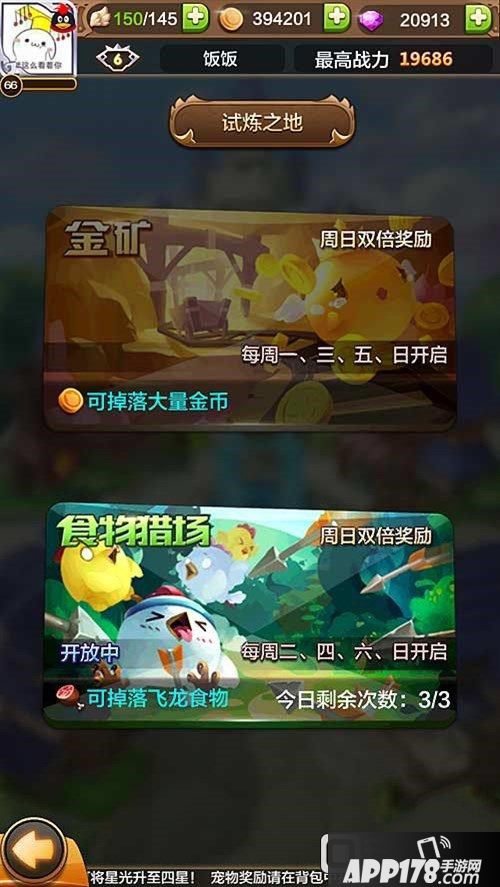 今天小编给大家带来的是驯龙战机3D试练之地狂揽金币 物大作战的精彩内容,试炼之地有两种模式:金矿、食物猎场,金矿产出金币,每周一、三、五、日开启,食物猎场产出飞龙食物,每周二、四、六、日开启。两种模式需要注意的事项基本一样,下面来详细列举。