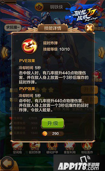 在6星以后,钢铁的主动技能核打击将升级为空间炮,在PVP时额外拥有连续发射爆炸式追踪导弹的效果。在其7星后,技能高温熔岩将升级为延时炸弹,PVP命中敌方有机率提升物攻,并放置延时爆炸的炸弹使敌人眩晕。不难看出,钢铁侠的升级版PVP新能力,将强力改写现有的PVP飞龙组合格局,为龙骑士们带来新的PK战斗乐趣。