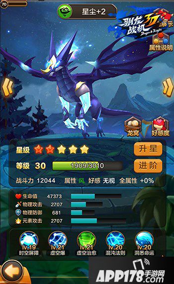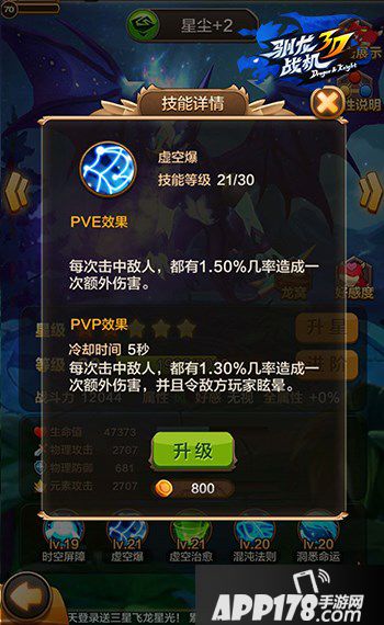 在6星以后,飞龙的主动技能“时间扭曲”将变为时空屏障,在PVP对战中获得封印敌方弹道的特殊能力。技能残影闪也将在7星后进化为虚空爆,PVP对战时额外增加令敌方眩晕的能力。随着星级的提升,星尘的五个被动技能将被逐渐升级,从而掌握强大的PVP能力!