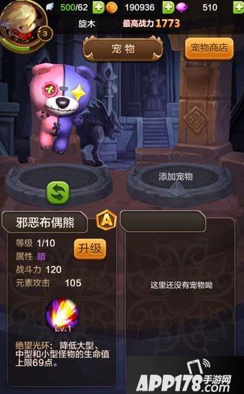 在整个宠物的造型上,邪恶布偶熊延续了一贯的风格,首先给人一种恐怖的赶紧,他的属性也是暗属性,初始一级的战斗机就达到了120,元素攻击105,他的技能名字叫做绝望光环,降低大型,中型和小型怪物的生命值上限69点。还是一个比较实用的技能,对于玩家的帮助还是十分给力的,因此建议大家多多去使用这个宠物。
