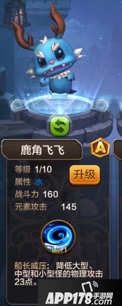 驯龙战机3D鹿角飞飞图鉴,A级别水系宠物。刚抽到的新鲜宠物,水系的一个A宠,战斗力方面都是一样的,不过技能是降低对面的物理攻击,对付物理型敌人十分有效果。