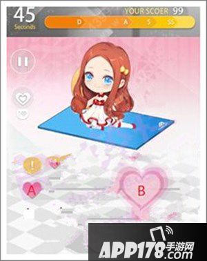 小桃心A的位置随着我们的移动而改变,大桃心B则随机出现在标尺的某个地方!屏幕左上角会倒计时,旁边显示玩家的即时分数和对应等级。