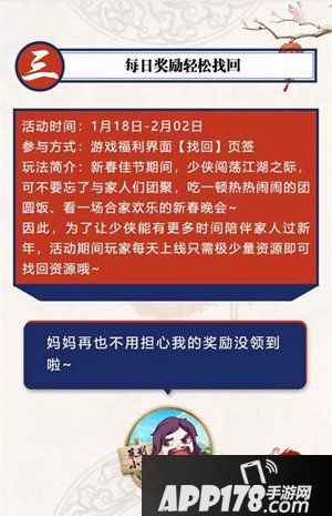 春节不打烊,狂欢不停歇,《天龙八部手游》重磅打造的新春狂欢盛宴已经“上桌”,恭请广大玩家亲身“品尝”!闯荡江湖和家人团聚不可兼得?找回活动来解决!为了当玩家能够有更多时间陪伴家人过新年,活动期间玩家每天上线只需极少量资源即可找回每日奖励。