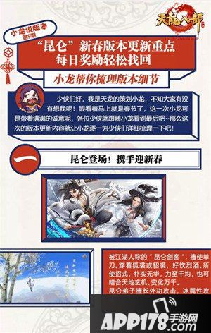 《天龙八部手游》2020年第一个资料片,同时也是游戏献礼新春特别打造的全新版本“昆仑之巅”现已火爆上线,全新门派昆仑、全新玩法英雄乱斗以及迎新春缤纷主题活动同步登场,狂欢嗨不停。在全新一起的“小龙说”中,游戏策划小龙还精心为广大玩家详细梳理了此次更新重点,助力玩家轻松玩转新版本,精彩内容一网打尽!