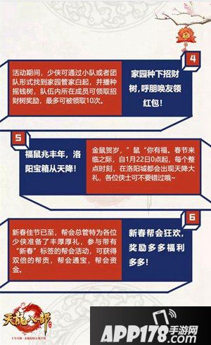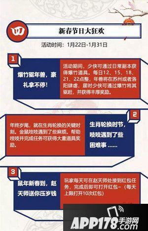 爆竹驱年兽,豪礼拿不停!活动期间玩家通过日常副本可收集爆竹道具,在指定时间内使用爆竹道具驱赶年兽就可以获得丰厚奖励;年终岁尾,帮助金鼠吱吱完成任务可获得大量道具奖励;鼠年新春到,赵天师送你压岁钱,玩家每天可在赵天师处接到红包任务,完成即可打开红包领取奖励;赠人玫瑰,手有余香,家有招财树更要呼朋唤友来同享,活动期间玩家可通过参与活动在家园内种下摇钱树,队伍内成员就可以领取到招财树奖励;福鼠兆丰年,自1月22日0点起,每个整点时刻,在洛阳城都都会出现天降宝箱;新春帮会也开启了狂欢模式,参与带有“新春”标签的帮会活动,可获得双倍的帮贡、帮会通宝、帮会资金。更多惊喜福利在游戏里等着你!