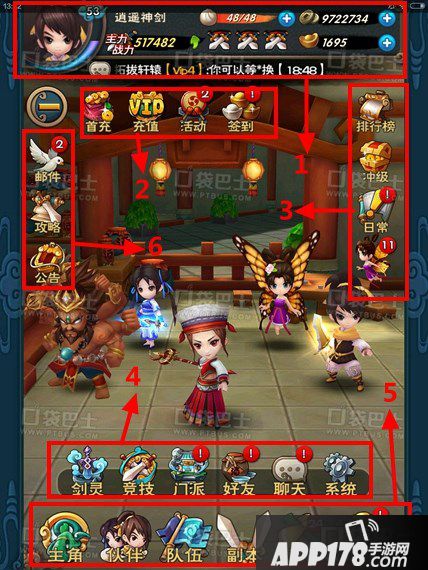 首先先介绍图中的1,这个是显示的分别是玩家的等级、经验条、名字、主战力、体力、PVP次数、铜钱和元宝。在这里小编特意强调一下,除非元宝高度富裕,否则不要拿元宝去换体力,非常的亏。至于铜钱,每日花一次聚宝盆就好。