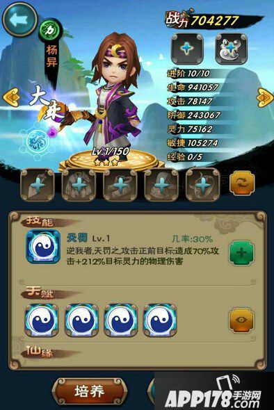 以1级+10的杨异为例,装备,镶嵌,法宝,练灵都无,仙緣仅激活10%敏,放到队伍替补阵容时的属性面板图为: