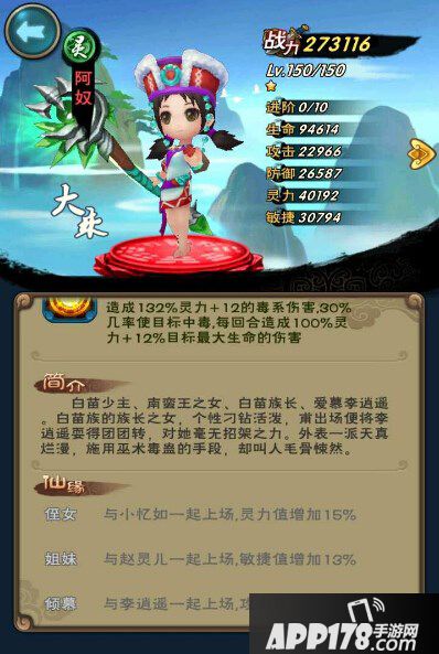 阿奴:全体,132%灵力的毒伤,30%概率出毒,每回合造成100%灵力+对方12%生命的毒伤。在镶嵌灵卡时,由于灵卡灵力成长高的原因,配合雷神也能打出不错的伤害,出毒1,2回合秒更是不在话下。总评优+神卡。