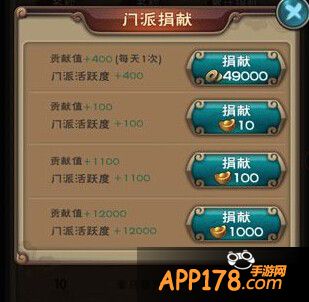 通过每天的捐献,可以获得贡献值以及活跃,每天有1次为铜钱捐献,49000铜钱获得400贡献值和活跃度,此外就是可以使用元宝捐献,无次数限制。