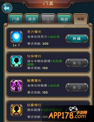 贡献值还有一个用处就是在书院就学习技能和升级技能,从上图可以看到都是给伙伴带来属性加成和战斗获得奖励加成等效果的,所以加入门派非常有必要!