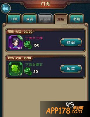 通过捐献获得的贡献值可以在门派商店购买女娲石以及伙伴元神,小编加的工会商店中目前只有一个紫色伙伴元神和下品女娲石可购买,以后应该会越来越多。