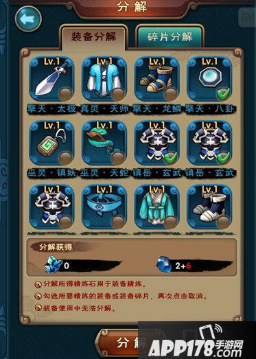 在我们点开背包之后,我们会发现下满多了一个按钮,“分解”,那么点开分解之后就发现一些我们包里的装备可以分解了,通过分解装备,我们将可以获得一部分的精炼石,装备碎片也是可以分解的。