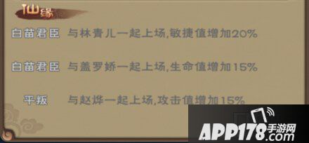 1、白苗君臣:与林青儿一起上场,敏捷值增加20%