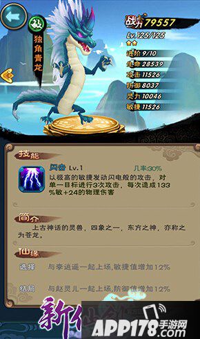 独角青龙作为四象神兽之一,虽然只是2星橙卡,但简单易出的仙缘(李逍遥、赵灵儿、林月如)和低廉到令人发指的培养成本,造成了独角青龙超高的性价比,平民玩家PVP必备!技能【闪击】:以极高的敏捷发动闪电般的攻击,对单一目标进行3次攻击,每次造成126%敏+24的物理伤害。这样一张卡牌在培养起来之后,单杀能力将达到一个恐怖的境地,追杀对方残血目标轻而易举,堪称补刀专业户。