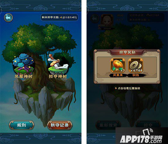 此外,除了精心栽培自己的神树,玩家每日还有10次机会发起挑战,掠夺其他玩家的神树,挑战机会每2个小时恢复1次。成功掠夺后将会获得一个凤凰果实,不过为保护神树,1级神树被掠夺时将不会有损失。你也可以邀请好友来帮忙守护神树,每个好友有两次帮助防御的机会。想要更多的果实和财富吗?尽情发起进攻,掠夺才是王道!