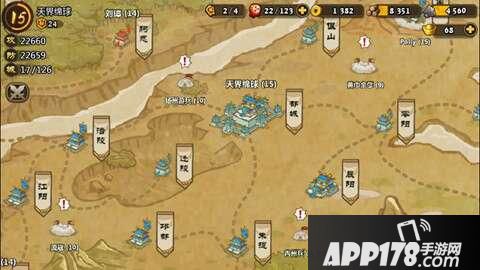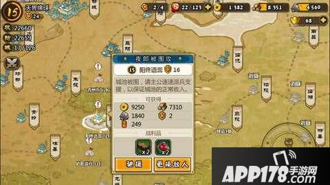 2、在“天下”界面中攻打和占领新城,获得战功。占领的城市会随机出现被玩家围攻的情况,这个时候,可以选择驰援,战胜敌人能够获得比较可观的资源奖励以及战功奖励!