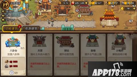 功能建筑物目前一共有五种,分别是兵营、驿站、鼓楼、计略府、八卦台;