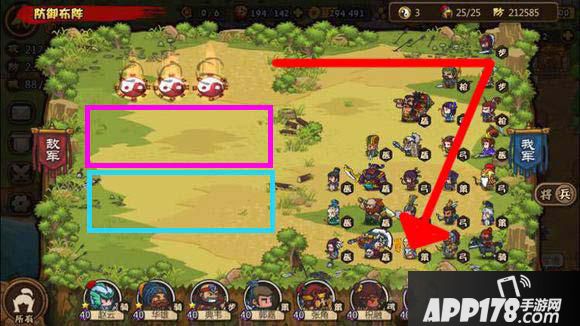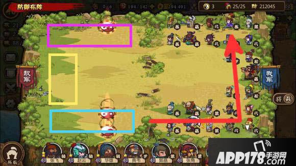 克制方法:红箭头为突破方向,蓝色框体为奶妈集中地,紫色框体为远程火力单位。下路空置(可适当将一盾兵单独放置,许诸最佳,周泰最下路替补)拖延敌正面部队攻伐,掩护我方延着红线突破的部队,上路进攻以计略辅助,借东风压制,美人计控制,骑兵则以华佗术(虎豹骑)辅助。