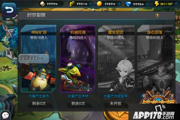 当玩家达到15级的时候,在试炼的界面内,时空裂隙便会开启,其内有四个日常副本,通关后即可获得大量,金币、木材、经验书等大量资源,这些资源无论是对于大R还是平民玩家,都是一笔绝不能错过的资源积累。