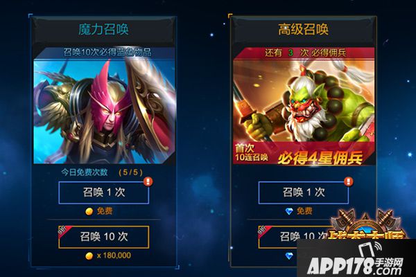 在危机四伏的魔兽世界中,到处都潜伏着许多凶险的敌人,所以要想进行更好的冒险,在旅途中寻找几个并肩作战的佣兵伙伴,是必不可少的。所以在祭坛的抽卡界面中,玩家每天都可以在这里获得免费抽卡的机会。除了抽取一些经验药水和重要材料以外,幸运的玩家们,还可以抽取到佣兵碎片或者整个佣兵英雄,但是免费的次数是有时间限制的,各位玩家可不要错过,一旦错过那可是要花费金币或者钻石才能抽取的。