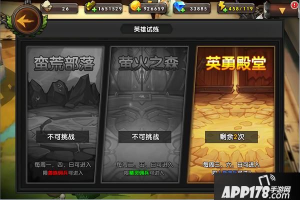 蛮荒部落仅允许兽族英雄进入,萤火之森则仅允许夜精灵英雄进入,而英勇殿堂只有人族英雄才能够进入,三个区域每天轮流开放。进入当天开放区域后有35级、50级、60级三个难度可以选择。