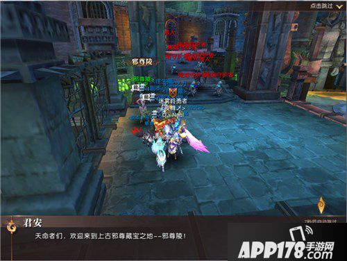 完成队伍匹配好之后,咱们就找到邪尊陵的副本NPC君安,然后跟君安对话,进入副本当中。进入副本之后,第一时间会弹出两个对话框。一是,是否跟站(或邀请队友跟站);二是开始剧情到邪尊陵副本。当君安讲话完毕之后,就可以开始进行寻宝了。