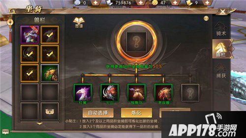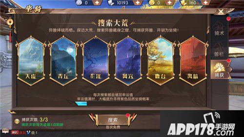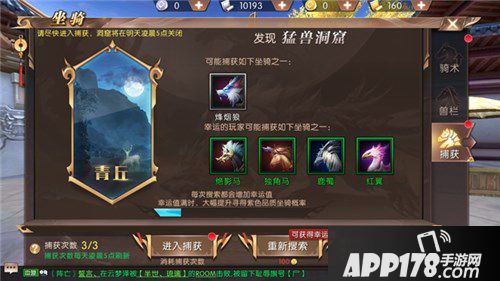 前期玩家会遇到的坐骑基本上是白色和绿色的普通坐骑,而且每天只可捕获三次(免费一次),在不断搜索大荒时,有一定概率遇到紫色品阶的坐骑,当然这需要一定的运气。不过每次搜索,玩家都会获得一些幸运值,幸运值越高,越有概率捕捉到高品质坐骑,如果有条件的话,每天三次的捕获次数千万不要浪费,即使赌不到运气,让幸运值日积月累也是于长远发展有利的。