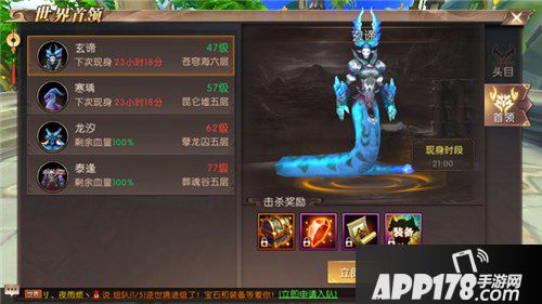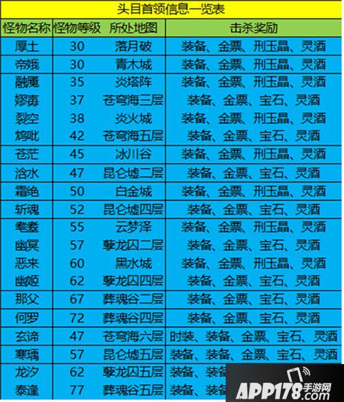 30级后在野外和地宫会出现世界首领和怪物头目,击杀与队伍平均等级和头目等级相差10级以内的头目可获得极品装备、宝石、金票、灵酒等奖励。建议组队前往,前期以个人之力难以击杀。