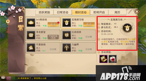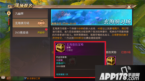 40级后每周六、日指定段可单人或组队报名【玄海演习场】,每日首胜可获得丰厚奖励,每日只可获得首胜奖励,20金票、灵酒(白)、银票5000。